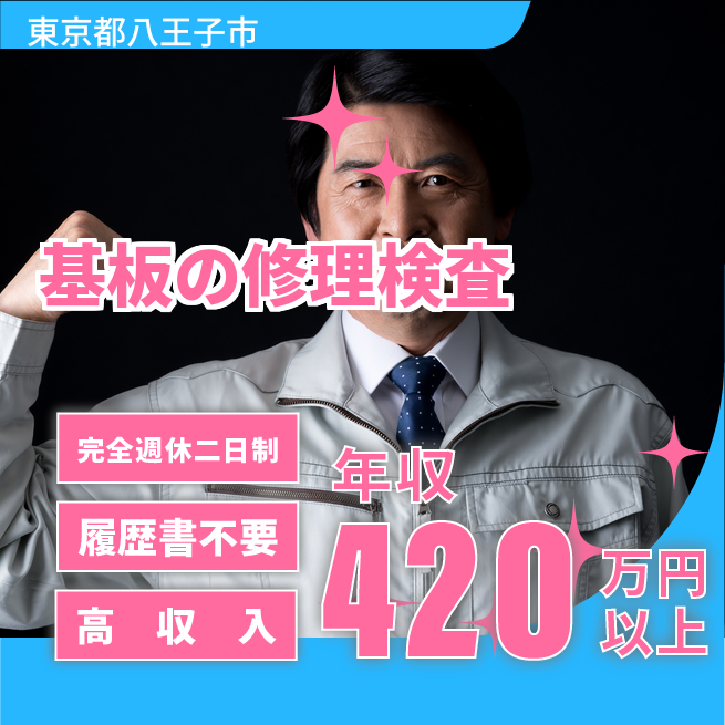 給与詳細 月収例 288,000円 時給例 1,800円 勤務地 東京都八王子市 仕事内容 プリント基板の修理業務。