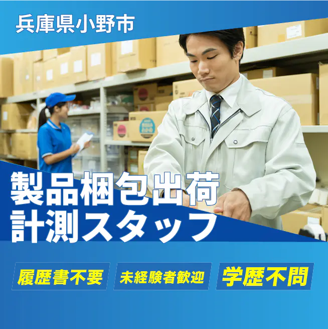 給与詳細 月収例 292,500円 日給例 12,000円 勤務地 兵庫県小野市 仕事内容 【製品梱包出荷計測スタッフ】