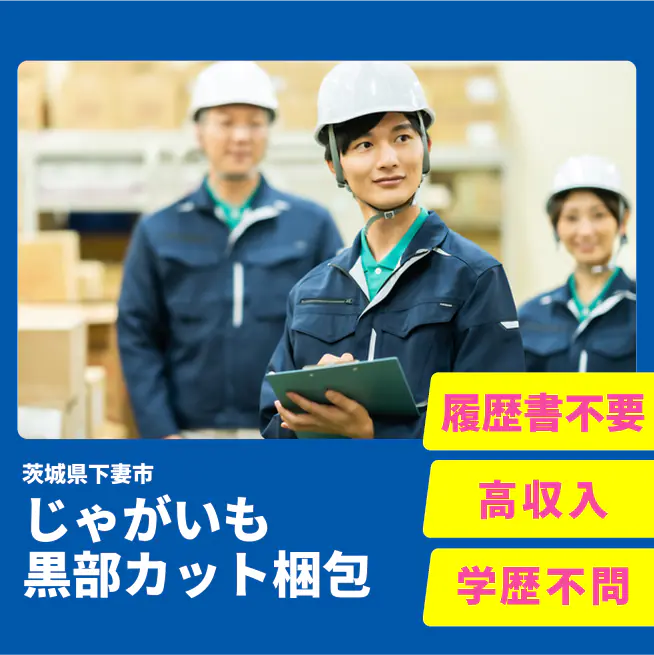 就業場所:全国(派遣先)/就業範囲:派遣先業務全般(詳細は就業条件明示書で明示する) 【じゃがいも黒部カット梱包】