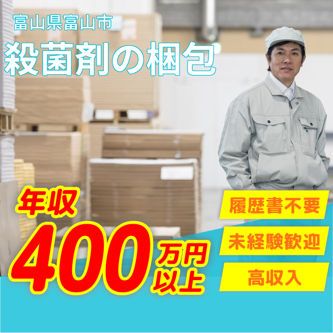給与詳細 月収例 260,000円 時給例 1,800円 勤務地 富山県富山市 仕事内容 <塩素系殺菌剤の梱包及び付帯する業務〉