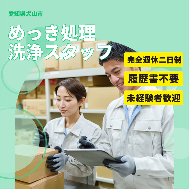 給与詳細 月収例 282,750円 日給例 11,600円 勤務地 愛知県犬山市 仕事内容 【めっき処理洗浄スタッフ】