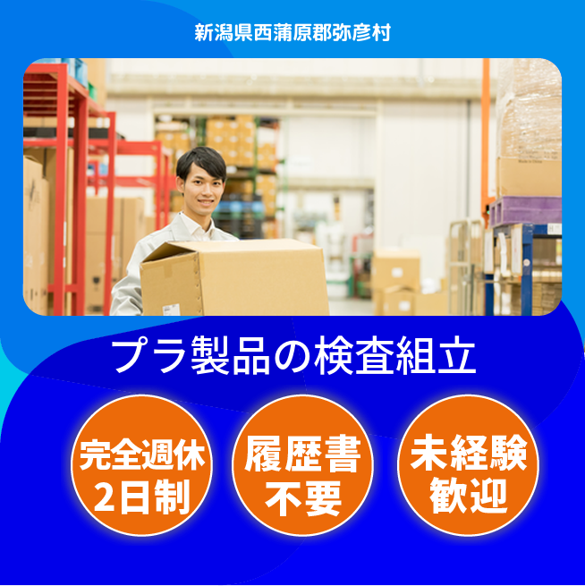 給与詳細 月収例 224,250円 時給例 1,150円 勤務地 新潟県西蒲原郡弥彦村 仕事内容 プラスチック製品の検査・組立・梱包