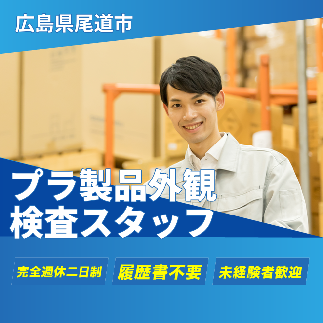 給与詳細 月収例 250,000円 日給例 12,500円 勤務地 広島県尾道市 仕事内容 【プラ製品外観検査スタッフ】
