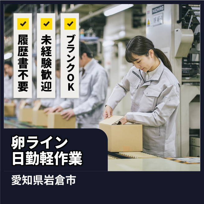 給与詳細 月収例 220,000円 日給例 11,000円 勤務地 愛知県岩倉市 仕事内容 【卵ライン日勤軽作業】