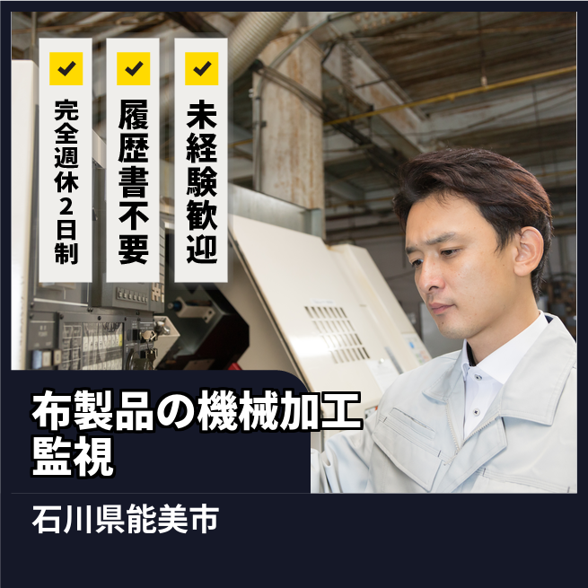 給与詳細 月収例 177,000円 時給例 1,180円 勤務地 石川県白山市 仕事内容 布製品製造企業様で、染色機(布の色を染める機械)の機械オペレーターと監視業務を行っていただきます。