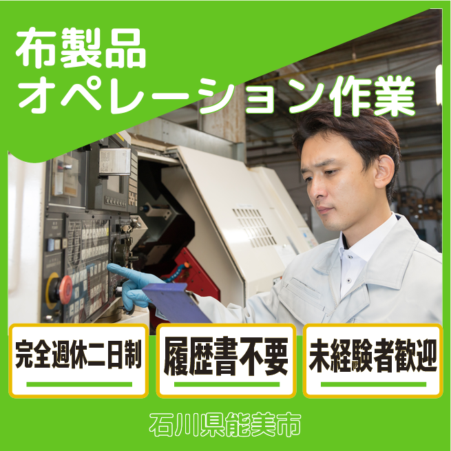 給与詳細 月収例 177,000円 時給例 1,180円 勤務地 石川県白山市 仕事内容 【布製品オペレーション作業】