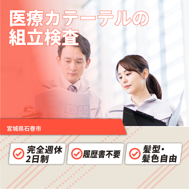 給与詳細 月収例 216,000円 日給例 10,800円 勤務地 宮城県石巻市 仕事内容 医療現場で使われるカテーテル(細い管状の製品)の製造を行うお仕事です。
