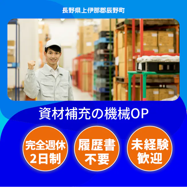 給与詳細 月収例 234,000円 時給例 1,200円 勤務地 長野県上伊那郡辰野町 仕事内容 機械オペレーター、資材補充業務