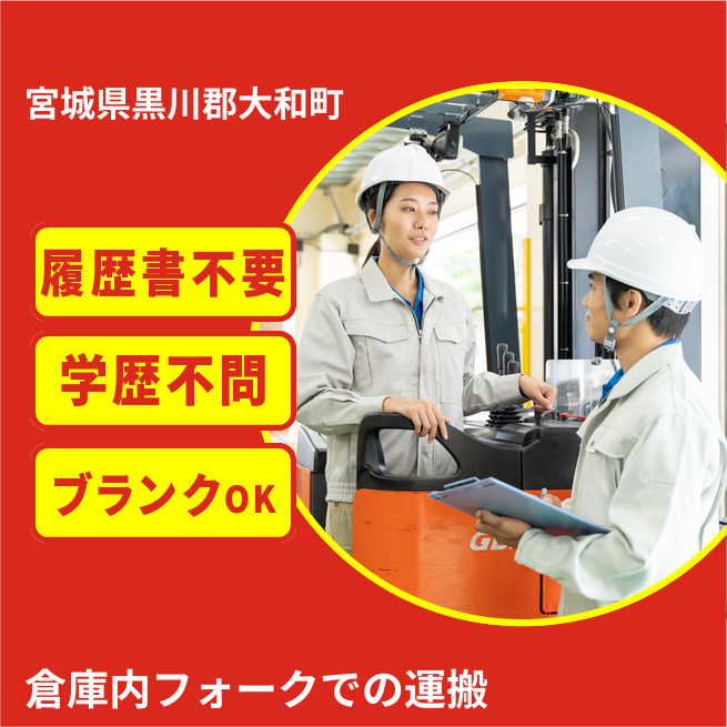 給与詳細 月収例 200,000円 日給例 10,000円 勤務地 宮城県黒川郡大和町 仕事内容 ≪フォークリフトでの運搬作業≫
