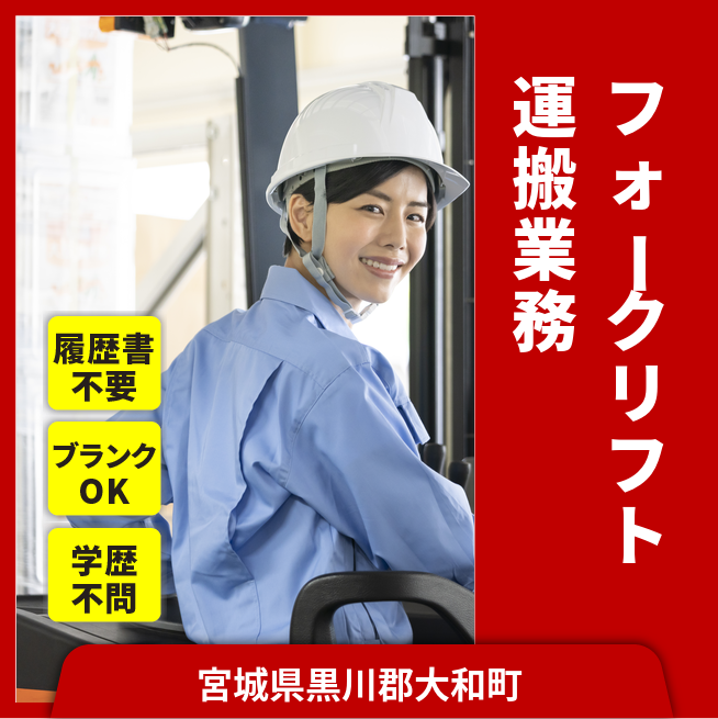 給与詳細 月収例 200,000円 日給例 10,000円 勤務地 宮城県黒川郡大和町 仕事内容 【業務内容】フォークリフトでの商品運搬作業
