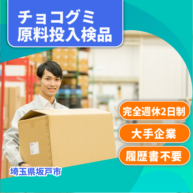 給与詳細 月収例 263,250円 日給例 10,800円 勤務地 埼玉県坂戸市 仕事内容 【チョコグミ原料投入検品】