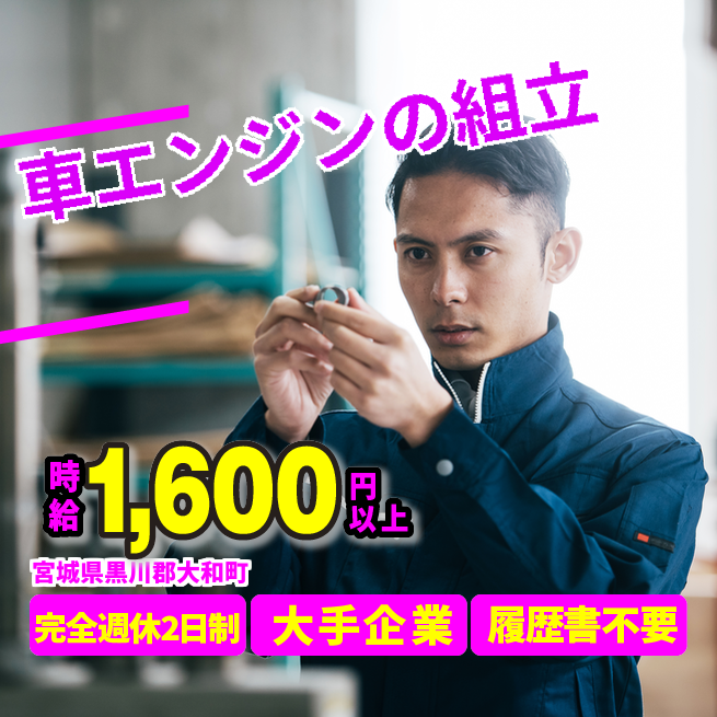 給与詳細 月収例 250,000円 時給例 1,600円 勤務地 宮城県黒川郡大和町 仕事内容 エンジンが1つのラインで流れてくるので部品をトルクレンチなどの工具で組み付け、ネジ締めなどの組立作業
