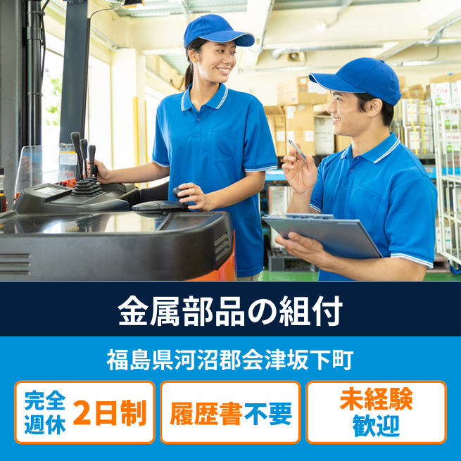 給与詳細 月収例 212,550円 時給例 1,090円 勤務地 福島県河沼郡会津坂下町 仕事内容 半導体製造会社での金属部品の組付け業務。
