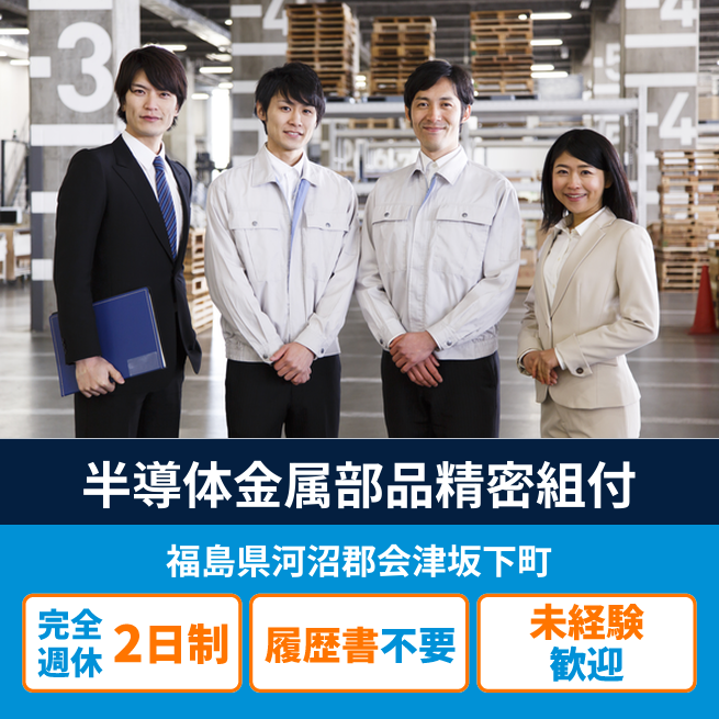 給与詳細 月収例 212,550円 時給例 1,090円 勤務地 福島県河沼郡会津坂下町 仕事内容 【半導体金属部品精密組付】