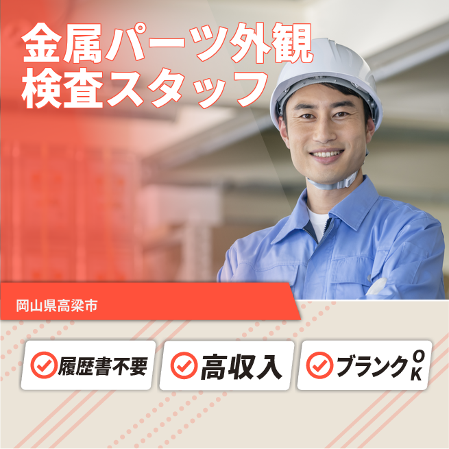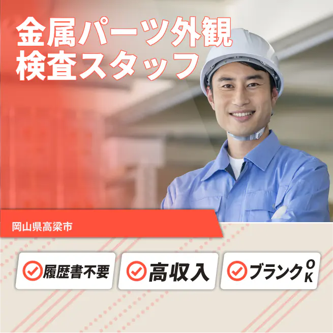 給与詳細 月収例 292,500円 日給例 12,000円 勤務地 岡山県高梁市 仕事内容 【金属パーツ外観検査スタッフ】