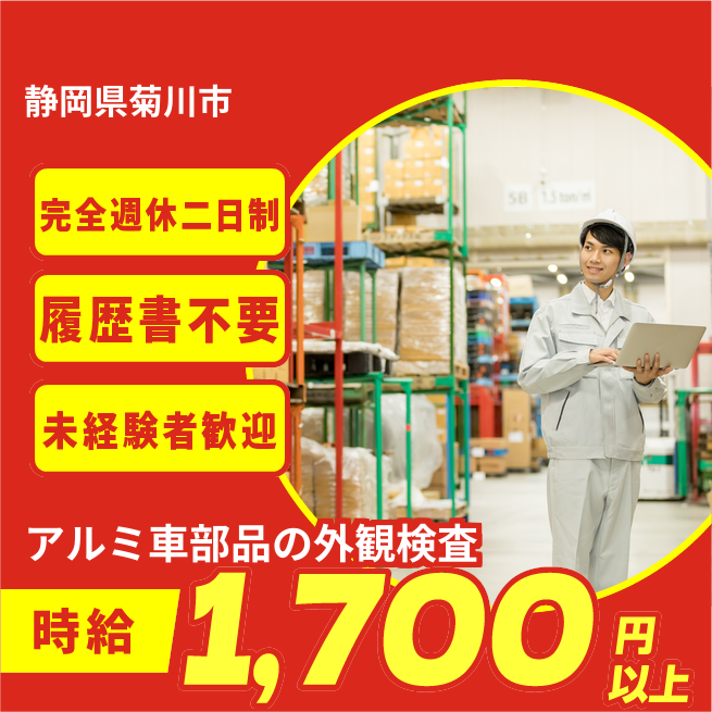 給与詳細 年収例 4,200,000円 月収例 350,000円 勤務地 静岡県菊川市 仕事内容 加工後の製品がマニュアル通りに加工されているか、キズ・バリ・汚れがないかを
