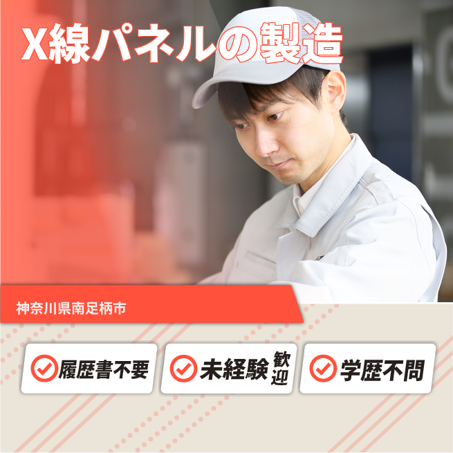 給与詳細 月収例 240,000円 日給例 12,000円 勤務地 神奈川県南足柄市 仕事内容 病院のレントゲンにて使用されるパネルの製造業務