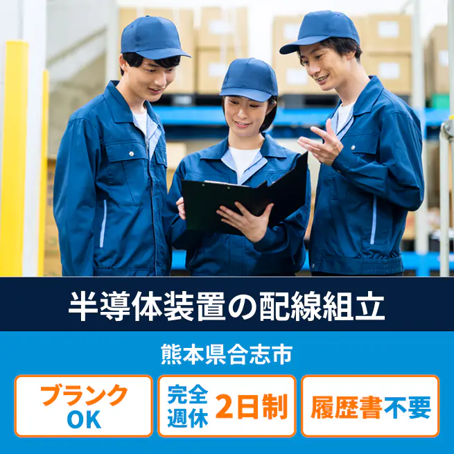 給与詳細 月収例 250,000円 日給例 12,500円 勤務地 熊本県合志市 仕事内容 ・クリーンルーム内での半導体製造装置の組み立て業務。ASSY組立、完成後の検査業務。