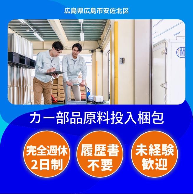 給与詳細 月収例 275,000円 日給例 13,750円 勤務地 広島県広島市安佐北区 仕事内容 【業務内容】