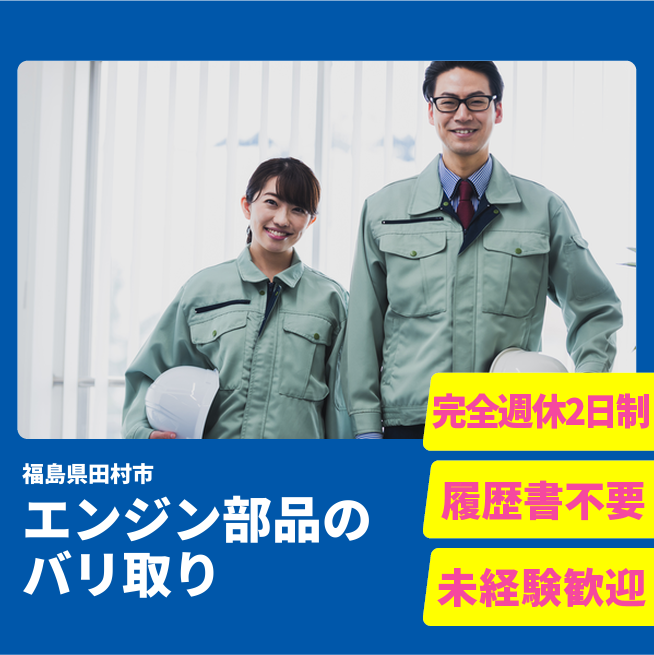 給与詳細 月収例 247,650円 日給例 10,160円 勤務地 福島県田村市 仕事内容 エンジンに使われる大事な金属パーツ(内燃機)をキレイに仕上げるお仕事です。