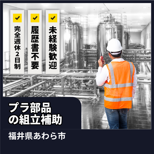 給与詳細 月収例 185,000円 時給例 1,150円 勤務地 福井県あわら市 仕事内容 ・プラスチック部品の組立・組付け