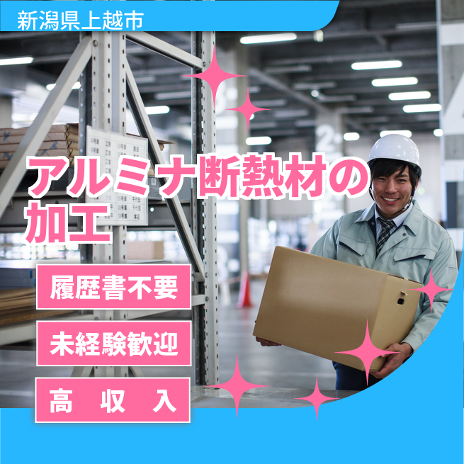 給与詳細 月収例 238,000円 日給例 11,900円 勤務地 新潟県上越市 仕事内容 製造ラインで作られたアルミナ繊維で出来た断熱材を加工(カット・含浸・乾燥・型抜き)する作業、加工製品を規格に照らし(重さ・厚さ)合否を判定、合格品を梱包する作業を担当します。自動化が進んでおり、ロボットがほとんどの作業をしています。そのため、段取りや梱包がメイン作業になります。機械の調整作業。空調もきいており、年中快適な環境での作業です。