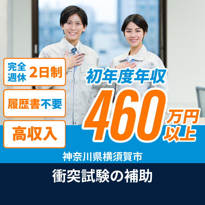 給与詳細 年収例 4,680,000円 月収例 390,000円 勤務地 神奈川県横須賀市 仕事内容 法に適合するように人形やクルマをセッティングし、クルマを壁に衝突させ衝撃を調べます!とっても『レア』なお仕事に携われるチャンス♪クルマの洗浄やサイズチェック、PCを使ったデータ収集などもあり!