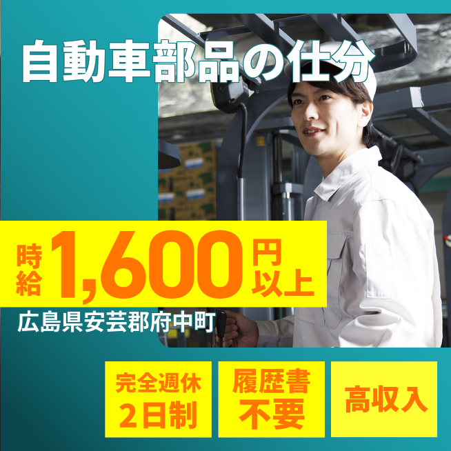給与詳細 年収例 4,200,000円 月収例 350,000円 勤務地 広島県安芸郡府中町 仕事内容 物流倉庫内で自動車部品の入出庫、自動車部品の仕訳・検収、空箱整理、目視検査、梱包