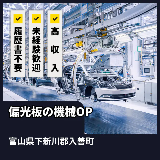 給与詳細 月収例 286,000円 日給例 14,300円 勤務地 富山県下新川郡入善町 仕事内容 車載用偏光板フィルムの機械OP