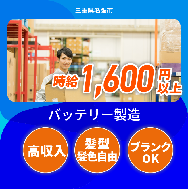 給与詳細 月収例 280,000円 時給例 1,600円 勤務地 三重県名張市 仕事内容 《社会を支える産業用電池の製造業務!》