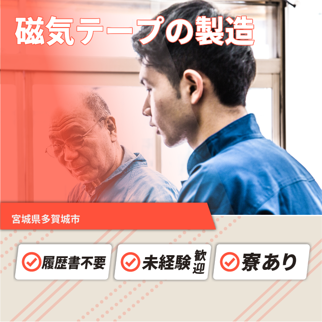 給与詳細 月収例 273,000円 日給例 11,200円 勤務地 宮城県多賀城市 仕事内容 磁気テープ製造工程(塗布・CAL・広幅DS)の製造、装置操作、検査及びそれらに付随する業務(ミーティング、清掃、帳票作成、保全業務補助等)