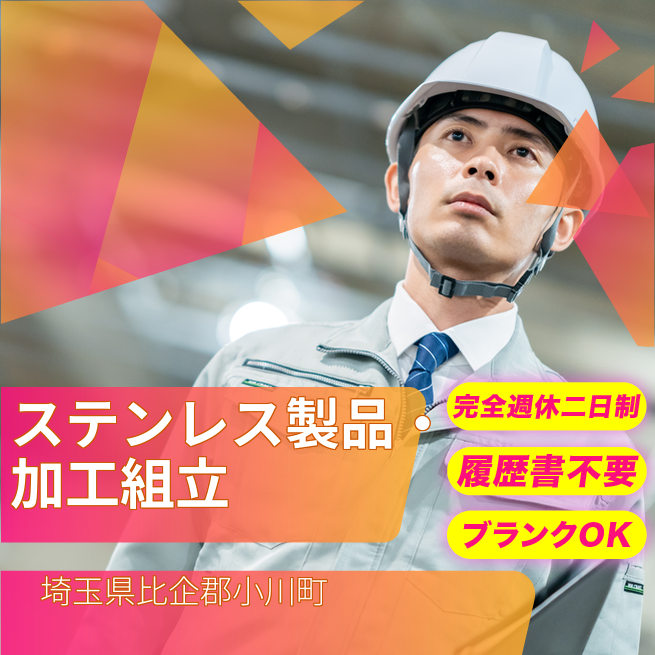 給与詳細 月収例 273,500円 日給例 13,675円 勤務地 埼玉県比企郡小川町 仕事内容 ステンレス製品の機械オペレーター、加工、組立、梱包業務
