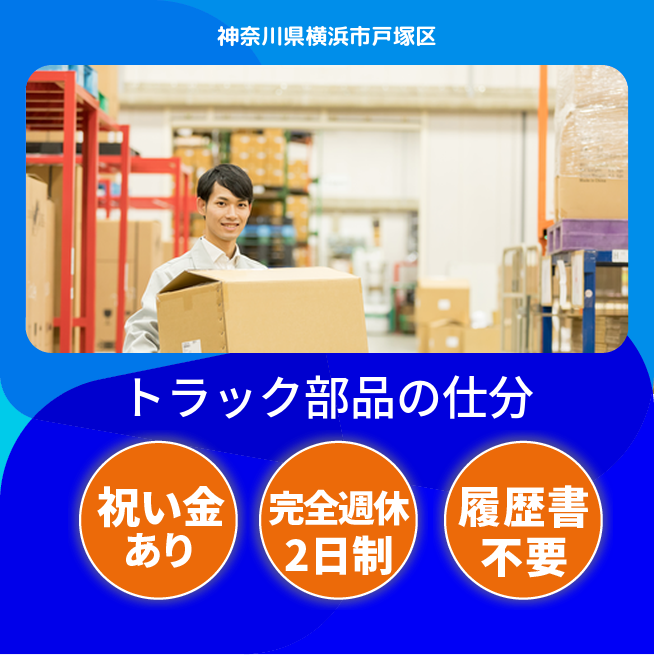 給与詳細 月収例 300,000円 日給例 15,000円 勤務地 神奈川県横浜市戸塚区 仕事内容 《輸出用トラック部品の出荷サポート》