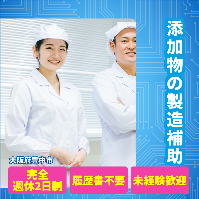 給与詳細 月収例 276,020円 日給例 13,801円 勤務地 大阪府豊中市 仕事内容 《クリーンルーム内で食品添加物の製造補助》