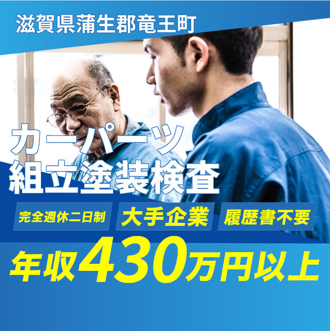 給与詳細 年収例 5,400,000円 月収例 450,000円 勤務地 滋賀県蒲生郡竜王町 仕事内容 【カーパーツ組立塗装検査】