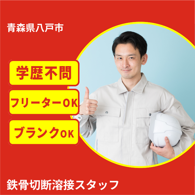 給与詳細 月収例 187,200円 時給例 1,170円 勤務地 青森県八戸市 仕事内容 【鉄骨切断溶接スタッフ】