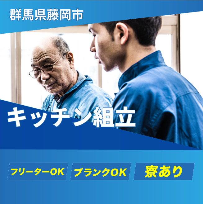 給与詳細 月収例 224,000円 日給例 11,200円 勤務地 群馬県藤岡市 仕事内容 システムキッチンの組立・加工作業。