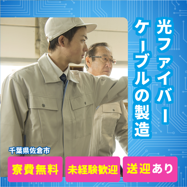 給与詳細 月収例 245,000円 日給例 12,250円 勤務地 千葉県佐倉市 仕事内容 通信・自動車などに使用される光ファイバーケーブルの製造マシンオペレーターです。クリーンルーム内でライン作業はありません。光ファイバーの素管(物干し竿くらいの長さのガラス管)を機械にセットします。光を通して、断線・亀裂などがないかを測定も行います。工場内に複数ある機械を指示通りに移動して作業を行います。この作業を繰り返し行うため歩き回る仕事です。ひとりでコツコツ作業ですが、部署によってはチーム制の工程もあります。