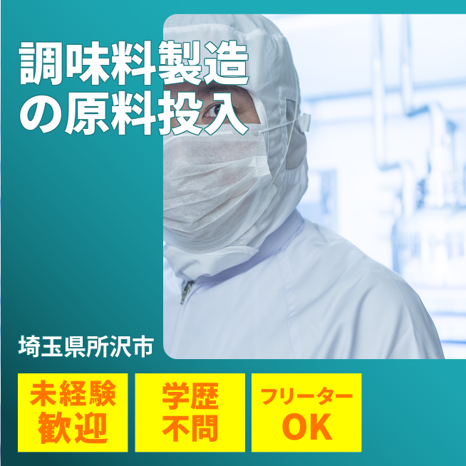 給与詳細 月収例 240,000円 日給例 12,000円 勤務地 埼玉県所沢市 仕事内容 業務用調味料の製造補助作業です。原料投入など重量物の扱いがあります。
