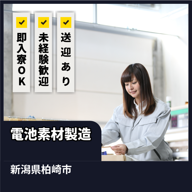 給与詳細 月収例 224,000円 日給例 11,200円 勤務地 新潟県柏崎市 仕事内容 充電式電池の組立やマシンの操作、運搬、出来上がった製品の検査。大きく3工程に分かれます。【マシンオペレーター】自動加工機械に素材をセットし、電池の中身を製造します。【部品加工】セルと呼ばれる部品を作ります。後工程でセルが複数接続、及びパッケージングされると、バッテリーになります。また、ハンドリフターを使用したセルの運搬作業もあります。【組立・検査】セルをつなぎ合わせ、バッテリーを組み立てます。ライン作業で完成品の検査もあります。