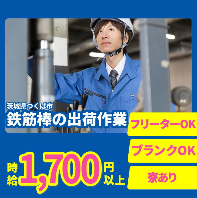 給与詳細 月収例 272,000円 時給例 1,700円 勤務地 茨城県つくば市 仕事内容 土木・建築用コンクリートの補強用として使用される鉄筋棒の出荷作業です。鉄筋棒を納入先別に種類や長さ別に準備し、トレーラーに積み込みます。天井クレーンを使用し、3~4人でチームを組み作業を行います。製品の置き場の管理や在庫の管理の業務もあります。