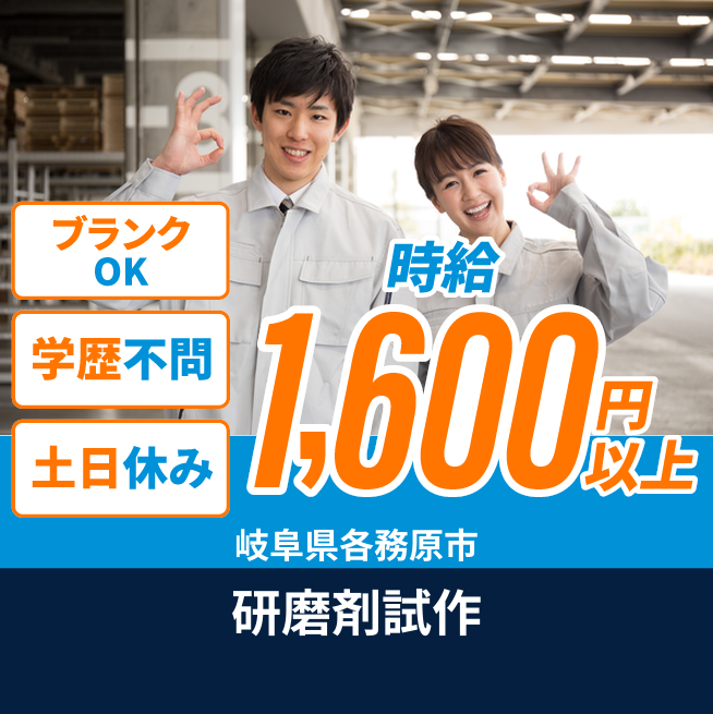 給与詳細 月収例 272,000円 時給例 1,700円 勤務地 岐阜県各務原市 仕事内容 半導体製造装置の研磨剤製造における試作業務です。①スラリーの調液。様々な種類の微粒子(砥粒)や化学薬品を、特定の配合比率に基づいて計量し、混合して研磨スラリーを製造します。精密な計量や混合技術が求められる場合があります。②スラリーの分析。調合したスラリーの特性(粒子の大きさ、分散性、pH値、粘度など)を測定・評価します。専用の分析機器を使用することもあります。③研磨評価。開発中のスラリーを使用して、実際に材料(半導体ウェーハなど)を研磨し、その性能を評価します。研磨装置を操作し、研磨後の表面の状態(平坦性、傷の有無、除去レートなど)を確認します。④試作作業。新しいアイデアや配合に基づいて、少量のスラリーを試作し、その特性を検証します。開発担当者の指示に基づき、様々な条件で試行錯誤を行います。20~25kgの原料や製品をパレットに積み重ねる作業があります。⑤検査・評価・管理。製造されたスラリーや研磨後のサンプルに対して品質検査を行います。データ入力や、サンプルの整理・管理なども含まれます。⑥その他付随する業務。実験器具の洗浄や準備、薬品の在庫管理、作業場の清掃・整理整頓など、研究開発業務を円滑に進めるための様々なサポート業務も含まれます。