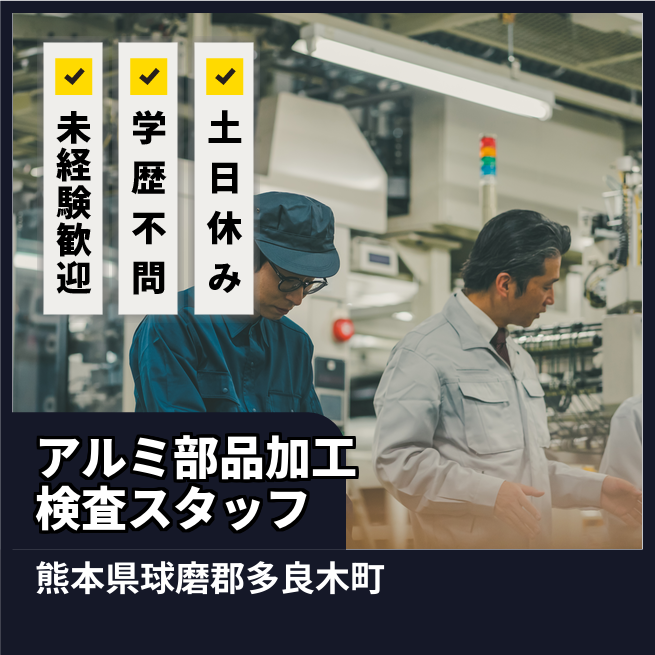給与詳細 月収例 216,000円 日給例 10,800円 勤務地 熊本県球磨郡多良木町 仕事内容 【アルミ部品加工検査スタッフ】