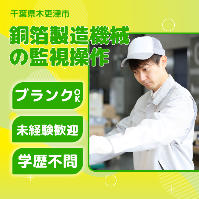就業場所:全国/就業範囲:派遣先業務全般(詳細は就業条件明示書で明示する) アルミホイルのような、銅で作る薄い箔を作る作業です。基本的に機械を監視しながら原料をセットして操作します。1日に数回程度、15kg前後の原料の持ち運び作業があります。