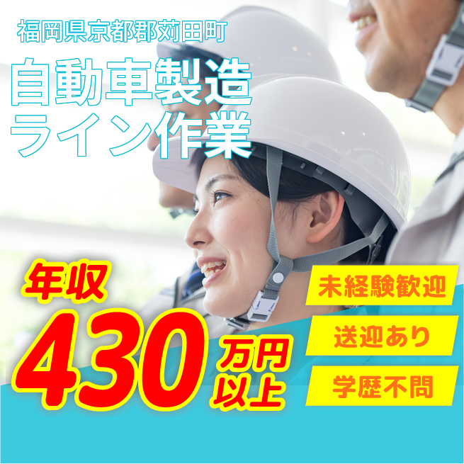 給与詳細 月収例 272,000円 時給例 1,700円 勤務地 福岡県京都郡苅田町 仕事内容 自動車製造に伴うライン作業。【組立】工具を使用し、車の本体にドア・タイヤ等を取り付け、完成車を作るラインです。【塗装】エンジンや車体に水が入らないよう、シーリング加工やエアブローを使ってほこりを取り除く作業や、機械により色を塗られた車に凹凸は無いか、傷は無いかの確認を行ないます。【溶接】自動車のフレーム部品の組立や組付作業等を行います。他にも機械オペレーター・検査・部品供給・ピッキングなど沢山の工程があります。