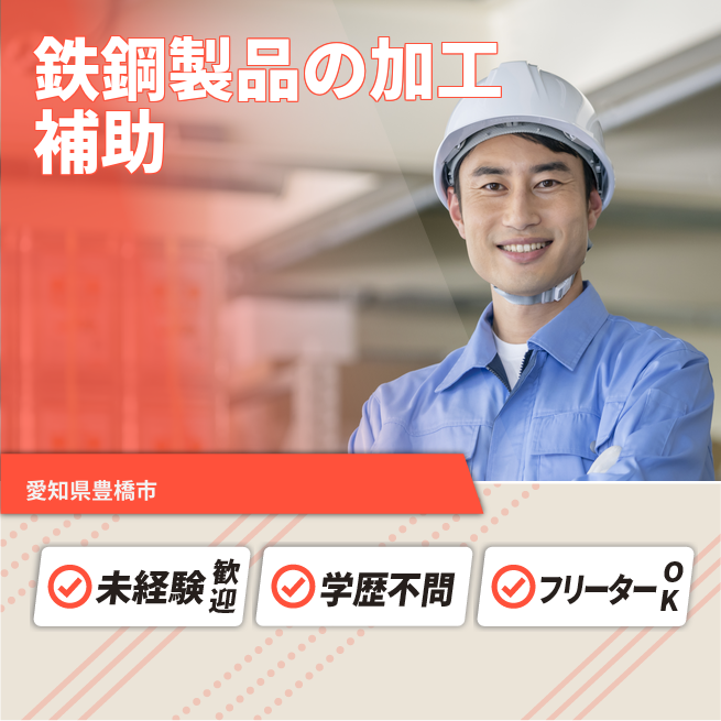 給与詳細 月収例 240,000円 日給例 12,000円 勤務地 愛知県豊橋市 仕事内容 鉄鋼製品加工の最終工程にて社員の方を補助する作業です。基本的に社員の方と一緒に行動します。