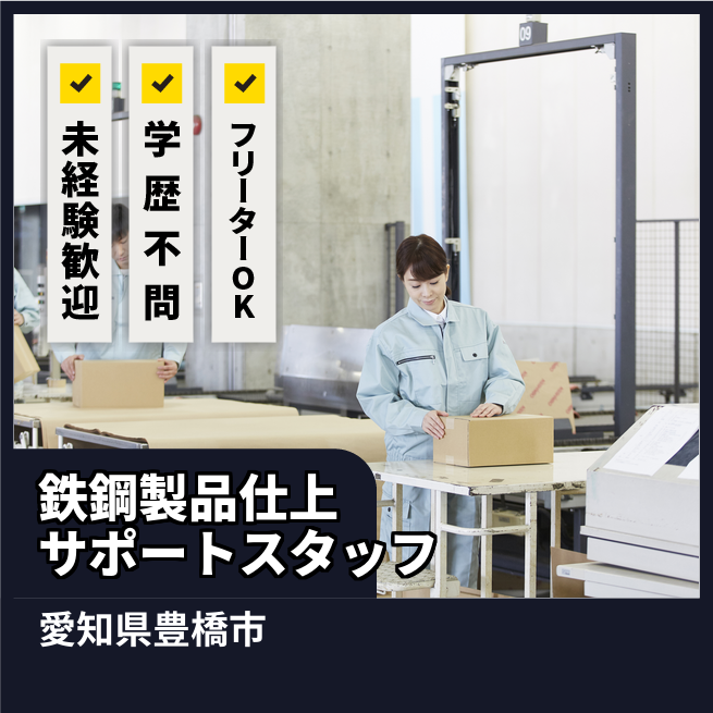 給与詳細 月収例 240,000円 日給例 12,000円 勤務地 愛知県豊橋市 仕事内容 【鉄鋼製品仕上サポートスタッフ】