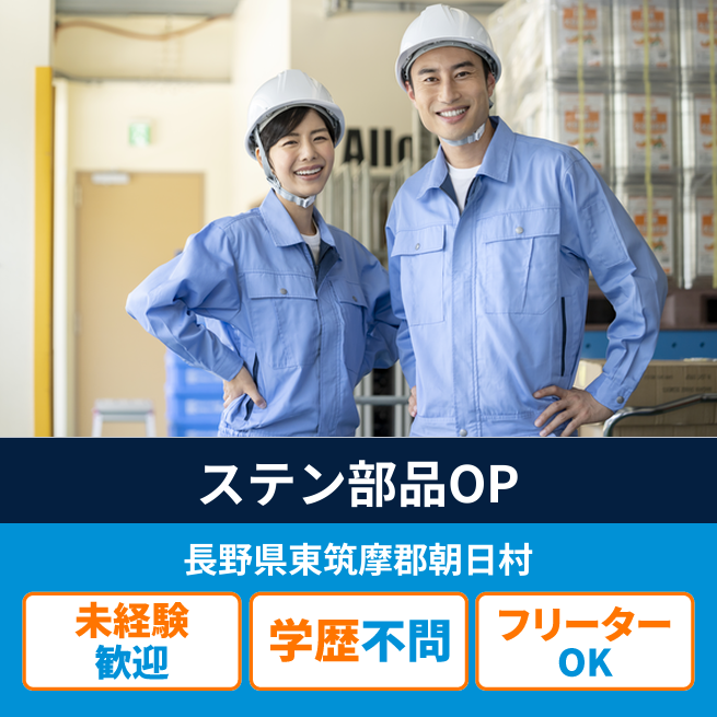 時給例:1400円 交通費 支給あり 応募の流れ 本ページ内<応募する>ボタンより、必要項目をご入力の上、ご応募ください。 勤務地 【勤務地】長野県東筑摩郡朝日村古見 勤務時間 【勤務地】①5:45~14:45②13:00~22:00③8:30~17:30※基本①②の2交替、変則的に③日勤も有り 必須資格 経験不問 福利厚生 ★社会保険完備、有給休暇制度有、通勤交通費支給、ワンルーム寮完備、赴任旅費支給、車通勤可、送迎バス有、制服貸与 ※勤務先による