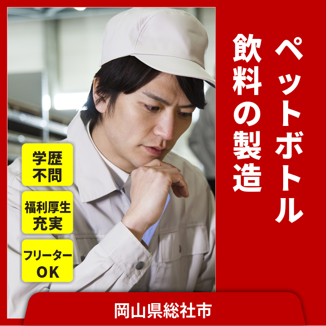 ※実際と異なるケースもございます。 交通費 支給あり 応募の流れ 本ページ内<応募する>ボタンより、必要項目をご入力の上、ご応募ください。 勤務地 【勤務地】岡山県総社市真壁 勤務時間 【勤務地】①06:30~15:30 休憩 60分