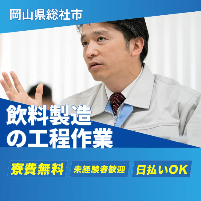 ※実際と異なるケースもございます。 交通費 支給あり 応募の流れ 本ページ内<応募する>ボタンより、必要項目をご入力の上、ご応募ください。 勤務地 【勤務地】岡山県総社市真壁 勤務時間 【勤務地】①06:30~15:30 休憩 60分